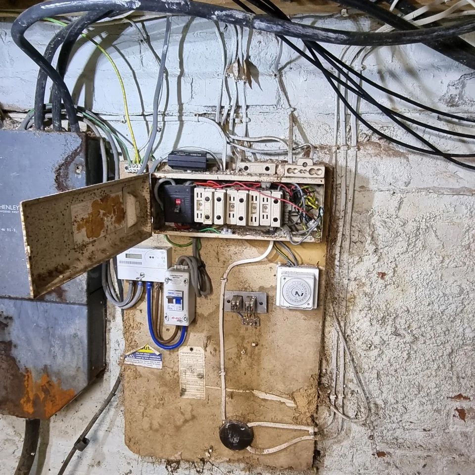 This old fusebox had no protection from electric shock or fire, exposed live parts, and asbestos in the fuse wire holders!